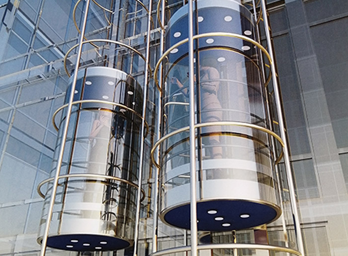 觀光電梯一種以電動機為動力的垂直升降機,裝有箱狀吊艙,用于多層建筑乘人或載運貨物。有一面或幾面的井道壁和轎廂壁是透明材料,乘客在乘坐電梯時,可以觀看轎廂外的景物。井道和轎廂壁至少有同一側透明,乘客可觀看轎廂外景物的電梯。主要安裝于賓館、商場、高層辦公樓場合,有一面或幾面的井道壁和轎廂壁同側是透明材料,乘客在乘坐電梯時,可以觀看轎廂外的景物。